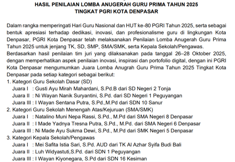 Dalam rangka memperingati Hari Guru Nasional dan HUT ke-80 PGRI Tahun 2025, PGRI Kota Denpasar menyelenggarakan Lomba Anugerah Guru Prima Tahun 2025 sebagai bentuk apresiasi terhadap dedikasi, inovasi, dan profesionalisme guru serta kepala sekolah di lingkungan Kota Denpasar.