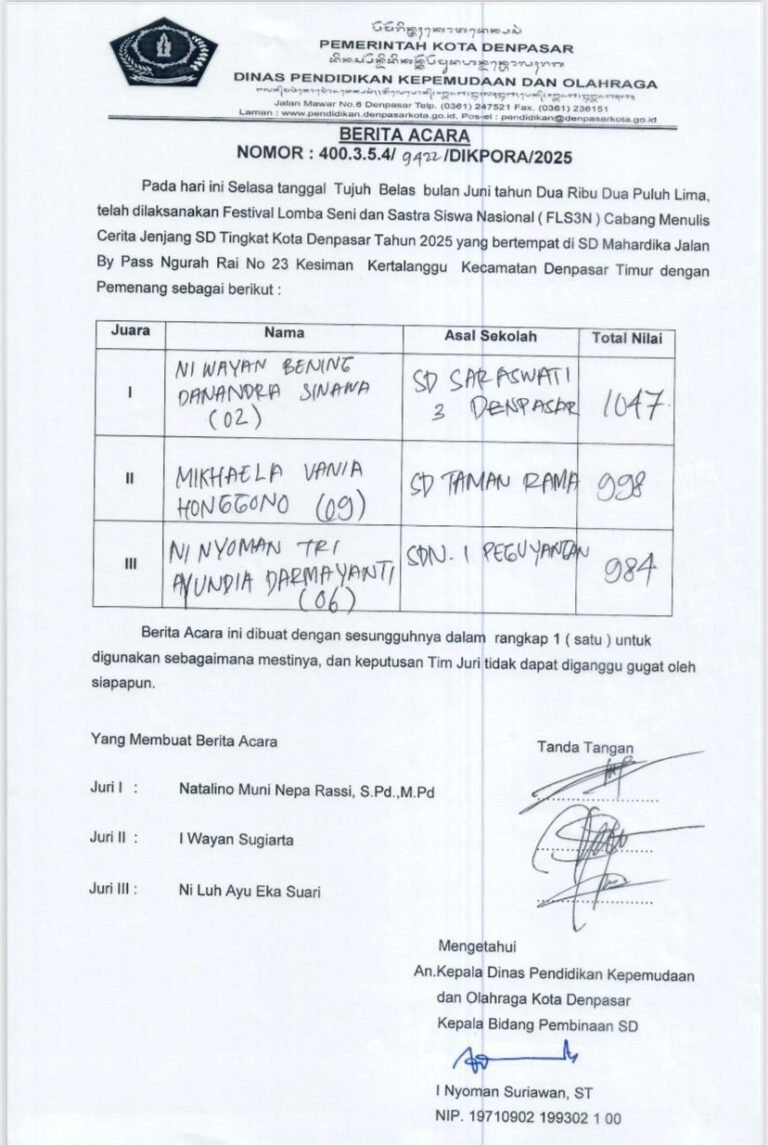 Selamat kepada Ni Nyoman Tri Ayundia Darmayanti, murid SD Negeri 1 Peguyangan, yang berhasil meraih Juara III Lomba Menulis Cerita pada Festival Lomba Seni dan Sastra Siswa Nasional (FLS3N) Tahun 2025 Tingkat Kota Denpasar.